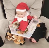 Lindsey Morris of Byrnes Mill took this 2021 Christmas photo of her then 1-year-old son, Luke Moris, dressed as an elf and reading “Little Blue Truck Christmas” to his stuffed animals.