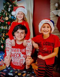 Alicia Vazquez of Festus sent in a picture of her children, Logan Ramsbottom with Kennedy Hinklin on his shoulders and Jackson Hinklin. Logan wears a special shirt for this Christmas photo.