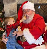 William Polley of De Soto, dressed as Santa, goes for a cookie in Oliver Orr’s hand. The picture was taken last month at Fireplace and Outdoor Living Supply in Farmington.