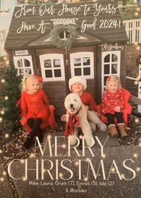 Laura Goodwin of Wildwood plans to carry on a tradition in honor of her father, who died in October. He loved Christmas cards, so she decided that this year’s card would be a recreation of picture his family, the Gurneys, took in 1974. “Themed Christmas cards started in the Gurney family over 75 years ago,” Laura said. Like the picture from the 70s, Laura’s children, Emma, 5, Grant, 7, and Isla 2, gather around the family dog, a goldendoodle puppy named Marbles.