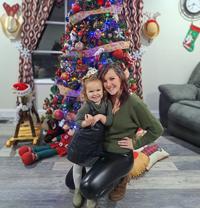 Emily Hill of De Soto and her daughter, Addie, 3, gather near the Christmas tree after going to see Santa at the Arlington Event Center in De Soto.