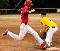 Festus Post 253 shut out De Soto SMCI 10-0 on Sunday, July 8, at De Soto High in an American Legion District 13 game. Festus starting pitcher Cody Knoll improved to 4-1 on the season, going six innings and allowing only one hit while walking two and striking out seven. Alex Winkelman pitched the seventh inning and struck out the side. Chris Lamprecht led the Festus attack with three hits in four at-bats, including two doubles, and drove in two runs. De Soto starter Brenden McKeon took the loss as SMCI closed out its regular season schedule at 5-22 overall and 4-15 in the district. Festus improved to 23-4 and 10-0 in district play and has won 18 of its last 19 games. Both teams will play next week in the District 13 tournament at Yanks Field in Ste. Genevieve, starting July 16. (Ted Howell photo: Jeremy Brown of Festus is safe on a close play as De Soto first baseman Colin Ijames takes in the throw.)