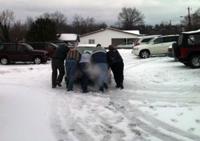 Leader newspaper staffers are ready to help, no matter what the task. Here, Joe, Glenda, Carol, Jeff and Debbie help push a car out of the slush. Share your snow photos with us at nvrweakly@aol.com.