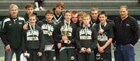 Herculaneum finished third and had two champions, Nick Maxwell at 152 and Billy Duncan at 170. The Black Cats’ Brian Duncan, who had suffered only one defeat in 38 matches this season, lost his 285-pound title match to DeSmet’s Nick Wunderli 5-4 in double overtime. Windsor freshman Dirk Tucker (120) and senior Tyler Warren (160) won their weight classes to help the Owls to a fourth-place team finish, while Hillsboro came in seventh, paced by 220-pound champion Jarad Sheppard. (Photo submitted by Lynn Minx of the De Soto championship team, from left: assistant coach Don Minx, Randy West, Alex Waggoner, Aaron Minx, Tyler Latham, Logan Ott, Lucas Fann, Cody Dedear, Dalton Adams, Ryan Brooks, Trae Adams and head coach John Brown.)