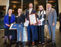 Dr. Julia Hampton and Blake Tilley of the Jefferson College Foundation receive the foundation's awards. From left are U.S. Congress District Office Director Donna Hickman, Hampton, Tilley, State Senator Elaine Gannon and Jefferson County Executive Dennis Gannon.