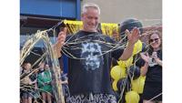 Guffey Elementary School archery coach John Ponzar on April 16 is covered with streamers as more than 100 students and parents surprised him after practice with the announcement that he has been named the 2026 NASP (National Archery in the Schools Program) Coach of the Year.