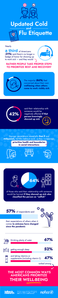 “The results of this survey reflect a significant cultural shift where taking care of one’s health is increasingly seen as more important than ‘powering through’ an illness,” said Marcela Kanalos, a spokesperson for Zipfizz. “While some may still feel compelled to show up despite being sick, it's clear that both personal well-being and social relationships are now top priorities for many, especially among younger generations who value boundaries and respect in social interactions.”