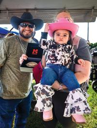 First Place in the Cutest Cowgirl Contest, Mia Fulhorst, 1, of Festus with her mom and dad, Kailee and Kyle.