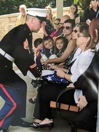 Marsha Shanks of High Ridge accepts a flag for her mother, Evelyn Schneider, who died in June. Three of Marsha’s grandchildren – Evelyn’s great-grandchildren – watch from the side. “(Evelyn) was in the Marines and was 99 at her passing,” Marsha said. “She was a post 111 commander and Girl Scout leader.”