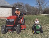 Camden Sauer and his grandpa, Mike Schrage, enjoy racing tractors around the yard last May.
