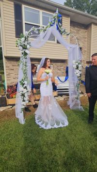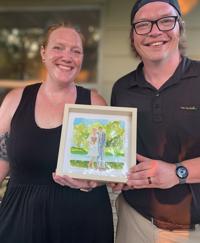 Annie and Donovan Davis of Arnold got married on July 1, 2024. In this photo taken about a week later, the couple hold up a watercolor painting, created by Donovan’s cousin, depicting the special day. “This was our ‘housewarming/reception’ for family and friends as we had a private ceremony,” Annie said. This picture was taken by Donovan’s mother, Jane Davis.