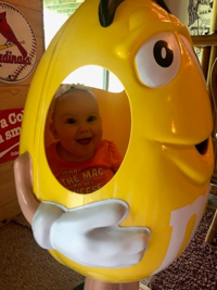 Pat Dennis of Robertsville took the first picture in 2019 of her granddaughter, Amelia Dennis. “Now that Amelia is 7, she still giggles when she sees it!” Pat said. “She was so into the big M&M, so we thought, ‘why not put her in and take a picture?’ Getting her out was a bit of a puzzle, but her smile says it all—she absolutely loved being inside.”