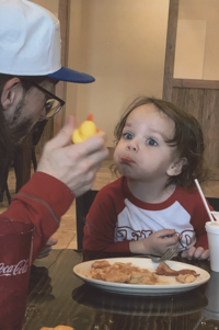 Mary and Glenn Armbruster of Festus sent a picture of their grandson, Cash Henry Armbruster of Florissant, and his dad, Greg Armbruster. “We were at the Beacon in Bloomsdale eating breakfast when my grandson didn’t want to eat,” Mary said. “So his dad was talking to Cash and was trying to coax him into eating by offering him a toy! I like the picture because Cash was showing his dad his sad face.”