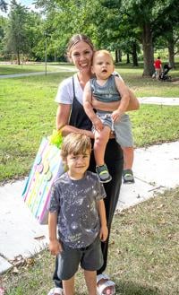 Shannon Plant with her son, Camden, 3, of Arnold on her shoulders having a fun time at the Free Family Fun event at the First Baptist Church on Main Street.
