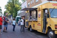 People lined up outside the Cheese Shack food truck.