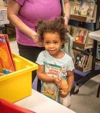 Hope Branine, 3, of Desoto finds a book she's interested in at the Twin City Days Festus Public Library Book Sale.