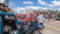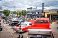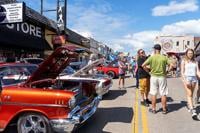 Main Street is filled with classic cars and people shopping, strolling and talking to classic car owners.