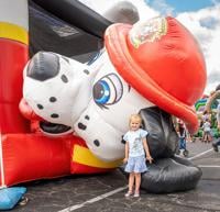 Denton Swan, 4, from Crystal City flying down the giant inflatable slide at the First Baptist Free Family fun during Twin City Days.