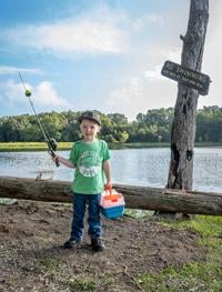 Bennett Hastings, 3, with his pole and tacklebox, looks for the right spot to fish at Hooked on Fishing on Sept. 9.
