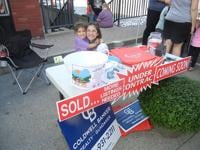 Adeline, 8, and her sister, Lydia, 4, just arrived and receive their sunglasses free from the Kids Games and Money Pit registration table.