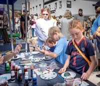 Ellie Moonier, 9, of Festus, Brantley Gatzemeyer, 7, and his brother, Barrett, 3, of Festus stop to paint a rock at the Fighting Chance Foundation on Main Street during Twin City Days.