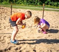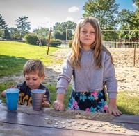 Cameron Bockhoff, 3, and his sister, Maddie, 7, from Festus are separating the sand from their coins found at the Money Pit during Twin City Days.