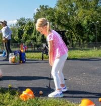 Kamryn Modde, 4, steps up with her golf club to putt into the bucket for a sticker at Kids Games in Crystal City Park during Twin City Days.