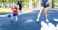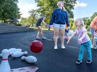 Mazikeen Maxwell, 4, of Crystal City tries bowling for a sticker at the Kids Games in Crystal City Park during Twin City Days.