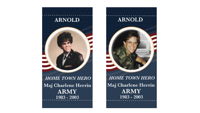 The image of the military member will be displayed on the front and back of the banner along with information about the person’s service.