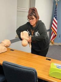 Rebecca Valandra of Fenton participates in Rock Community Fire Protection District’s CPR class. Rock Fire holds free CPR classes and first aid classes.