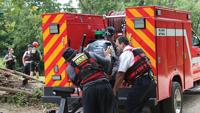 On July 18, crews from the two fire districts deployed inflatable and rigid-hull rescue boats on the Big River at Rockford Park to practice three rescue scenarios: lifting a dummy victim pinned by the current and the rock bluffs into an inflatable boat, throwing buoys into the water to observe the patterns of the current, and securing the boats to anchor points in the bluffs, used for stabilization as trapped victims are transported from the bluff face to the boats.