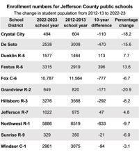 Of the 11 public school districts in Jefferson County, eight have seen declining student enrollment over the past 10 years, which affects funding and school operations.