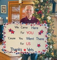 Jim Akers holds up a poster that greeted him when he returned from a daylong adventure to Washington, D.C., through Honor Flight.