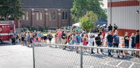 Families gather outside Immanuel Lutheran Church to get free school supplies and other items for their children.