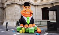 Mr. Riggs, a fat cat inflatable, sits during another rally in Pennsylvania.
