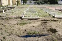 Rows of 202 graves, marked with white headstones and cement demarcations, are covered with shells.