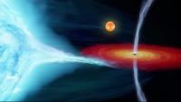 Artist's impression of the Cygnus X-1 binary system, showing how the wind of the supergiant star bends the black hole's jets away from the star as the objects move in their orbit around one another. (ICRAR via SWNS)