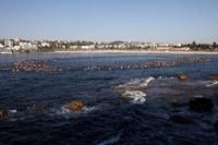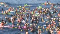 Swimmers and surfers paddled into a circle as they bobbed in the gentle morning swell, splashing water and roaring with emotion.