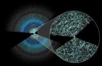 A thin slice of the map produced by the DESI five-year survey shows galaxies and quasars above and below the plane of the Milky Way. The Universe's large-scale structure is visible in the magnified inset. Earth lies at the center of the wedges, and the black gap marks where our own galaxy obscures distant objects. Light from the furthest galaxies shown is 11 billion years old by the time it reaches Earth. (Claire Lamman / DESI collaboration via SWNS)
