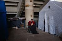 They are living in a tent in a section of the stadium where she is forced to ask Red Cross volunteers for help to get down the flight of steps leading to the only bathrooms she can access.