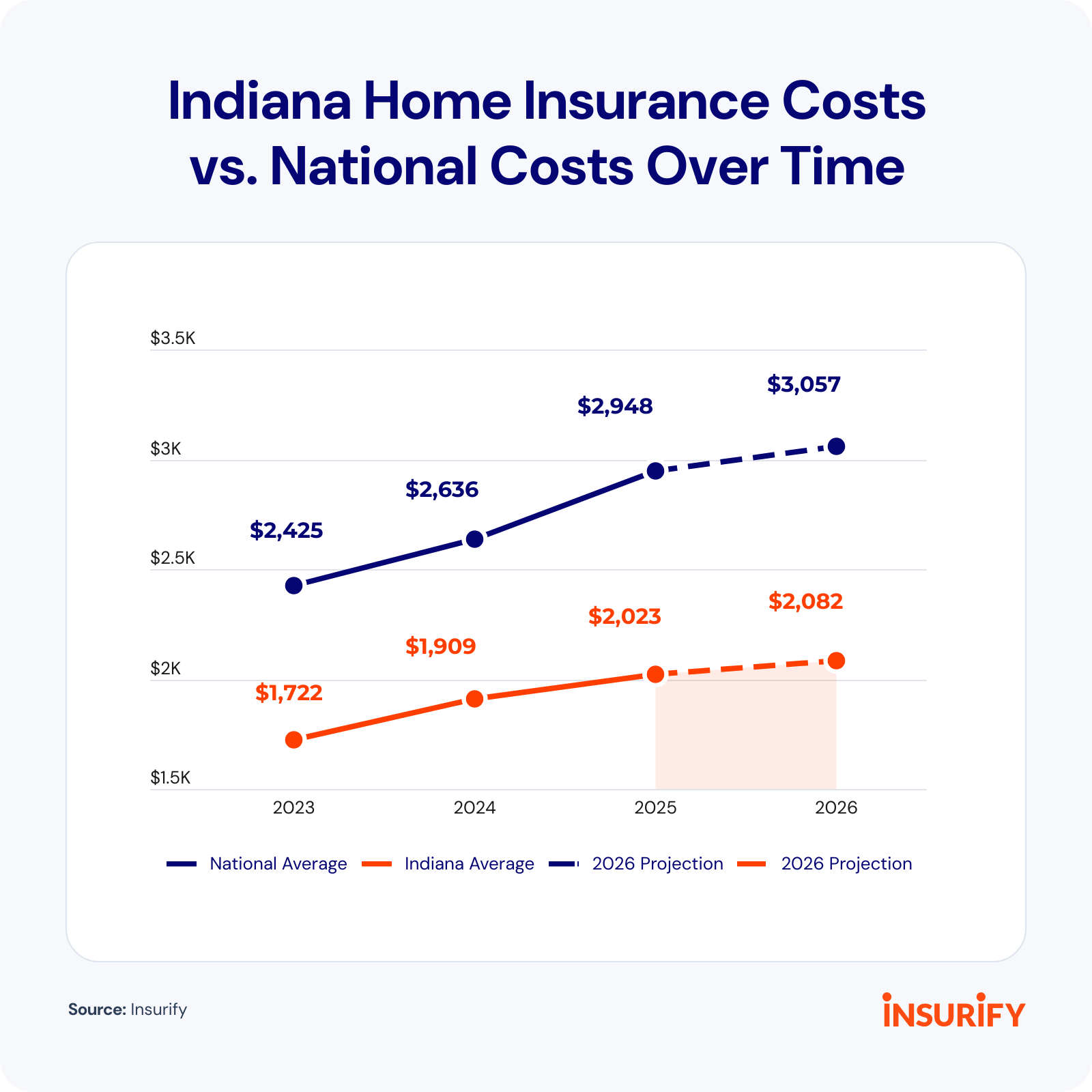 By the end of 2025, the average annual home insurance premium in Indiana was $2,023, according to Insurify’s 2026 Insuring the American Homeowner Report. That’s about 31% lower than the U.S. average of $2,948, but still 17.5% more than the 2023 state average, data shows.
