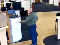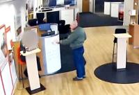 Security camera footage shows the moment the 64-year-old handed an unsuspecting staff member a note reading: "I have a gun, put the money in the bag."