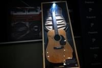 Taking centre stage is Noel Gallagher's cherry-red Gibson guitar, damaged by his brother Liam during a backstage brawl the night Oasis broke up at the height of their fame in 2009.