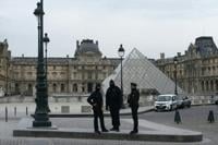 Soldiers patrolled the famed glass pyramid entrance, while evacuated visitors, tourists and passersby were kept at a distance behind police tape.