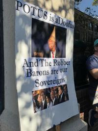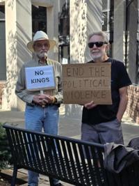 A few in the group held signs referencing H.R. 4405, the Epstein Files Transparency Act, calling on Congressman Meuser to "do the right thing." Others' signs expressed frustration toward wealthy people's needs being considered over working class constituents. Another called to "end the political violence."