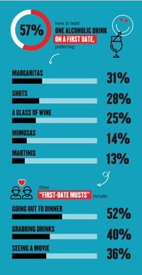 A majority have at least one alcoholic drink on a first date (57%) — preferring margaritas (31%), shots (28%), a glass of wine (25%), mimosas (14%) and martinis (13%).