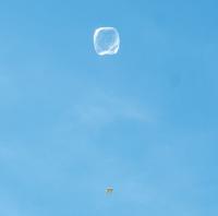 The balloon, tethered to a transmitter, rises into the sky.