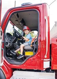 Barrett Gregory, 3, of Pacific explores a firetruck at the BackStoppers event.