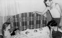 Hubert Propst of Crystal City is one of the infant triplets in this picture taken on Aug. 8, 1947, in St. Francois County by his grandmother, Alice Stringen. From left are Brenda, mom Helen, Harry, Herman, Hubert, Carl and dad Jesse.