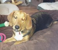 Adriatic, a female basset hound mix almost a year old, is available for adoption through Camp Chaos Puppy Rescue.